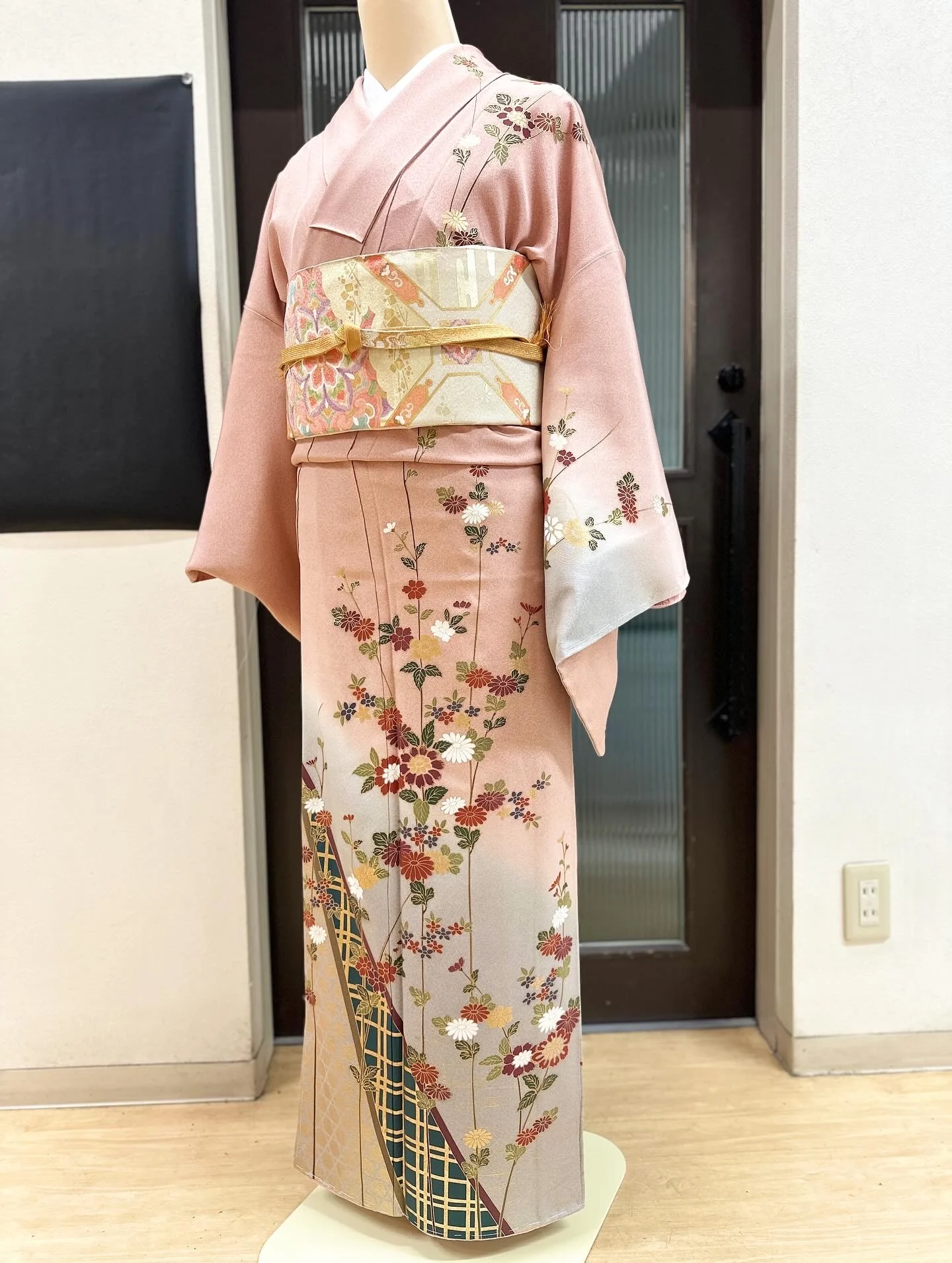 レンタル訪問着【S-4】ピンク 菊に格子柄